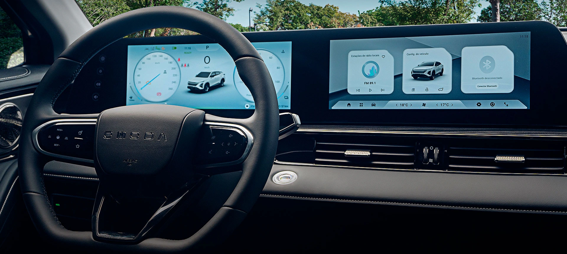 Central multimídia e painel de instrumentos integrados em uma tela panorâmica, com design moderno e comandos intuitivos.